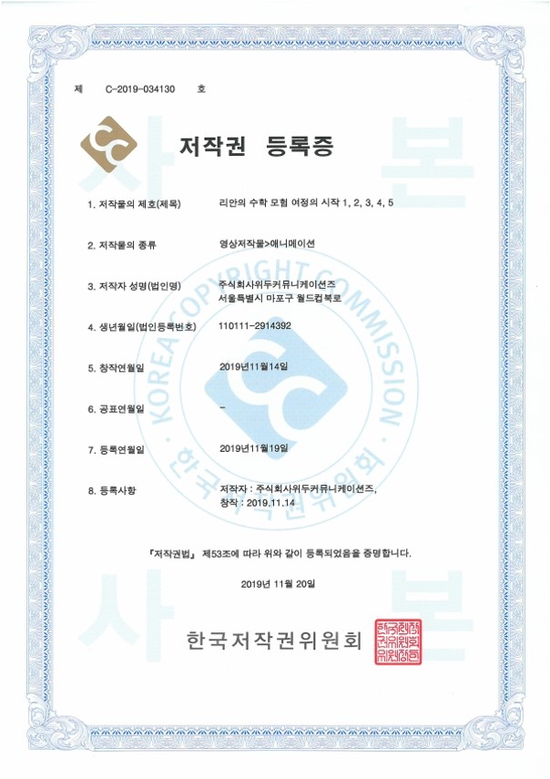[한국/저작권] 리안의 수학 모험 여정의 시작 1,2,3,4,5 페이지 정보 작성자 WeDu 댓글 0건 조회 6,121회 작성일 21-12-31 12:36 본문 2019-11-20 저작권 C-2019-034130 영상저작물>애니메이션 List Previous[한국/저작권] OLL KIDS/MATH 21.12.31 Next[한국/저작권] 리안의 수학 모험 애니메이션 OST 19.11.25