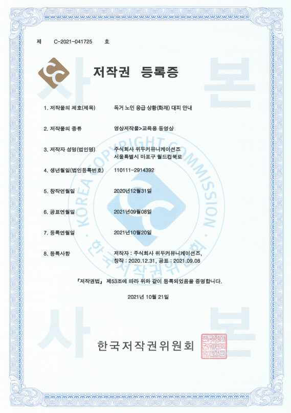 [한국/저작권] 독거 노인 응급 상황(화재) 대피 안내 페이지 정보 작성자 WeDu 댓글 0건 조회 6,642회 작성일 21-12-31 12:41 본문 2021-10-21 저작권 C-2021-041725 영상저작물>교육용 동영상 List Previous[한국/저작권] 장보기 인지훈련 게임 21.12.31 Next[한국/저작권] OLL KIDS/MATH 21.12.31