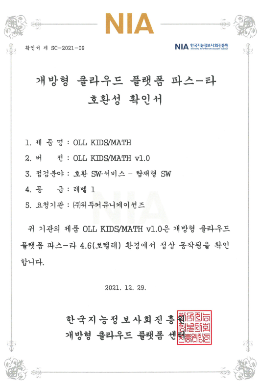 [한국/확인서] OLL KIDS/MATH 파스-타 호환성 확인서 페이지 정보 작성자 WeDu 댓글 0건 조회 10,618회 작성일 21-12-31 12:48 본문 2021-12-29 확인서 제 SC-2021-09 점검분야 : 호환 SW서비스 - 탑재형 SW List Next[한국/인증서] OLL KIDS/MATH 클라우드 서비스 확인서 21.12.31