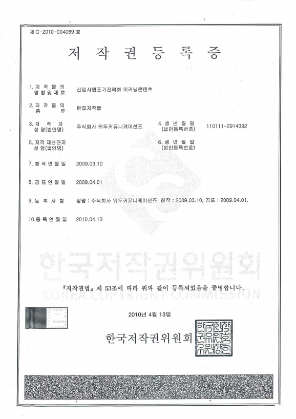 [한국/저작권] 신입사원조기전력화 이러닝 콘텐츠 페이지 정보 작성자 WeDu 댓글 0건 조회 6,285회 작성일 19-05-30 19:01 본문 2010-04-13 저작권 C-2010-004069 신입사원조기전력화 이러닝콘텐츠 / 편집저작물 List Previous[한국/저작권] 리안의 수학 모험 19.05.30 Next[한국/상표] OLL 41류 19.05.30